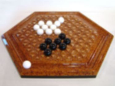 The game is arranged similar to chinese checkers but without starting spaces and with a moat around the.